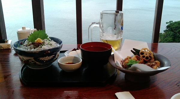 ↓生しらすと釜揚げしらすの「ハーフ丼」+たこ唐揚げ+麦酒