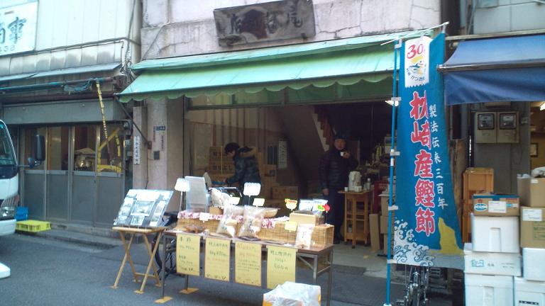 築地と言えば…と、ついでに友人の兄が営んでいる尾林商店へ立寄り鰹節(勿論血合い入り)購入♪